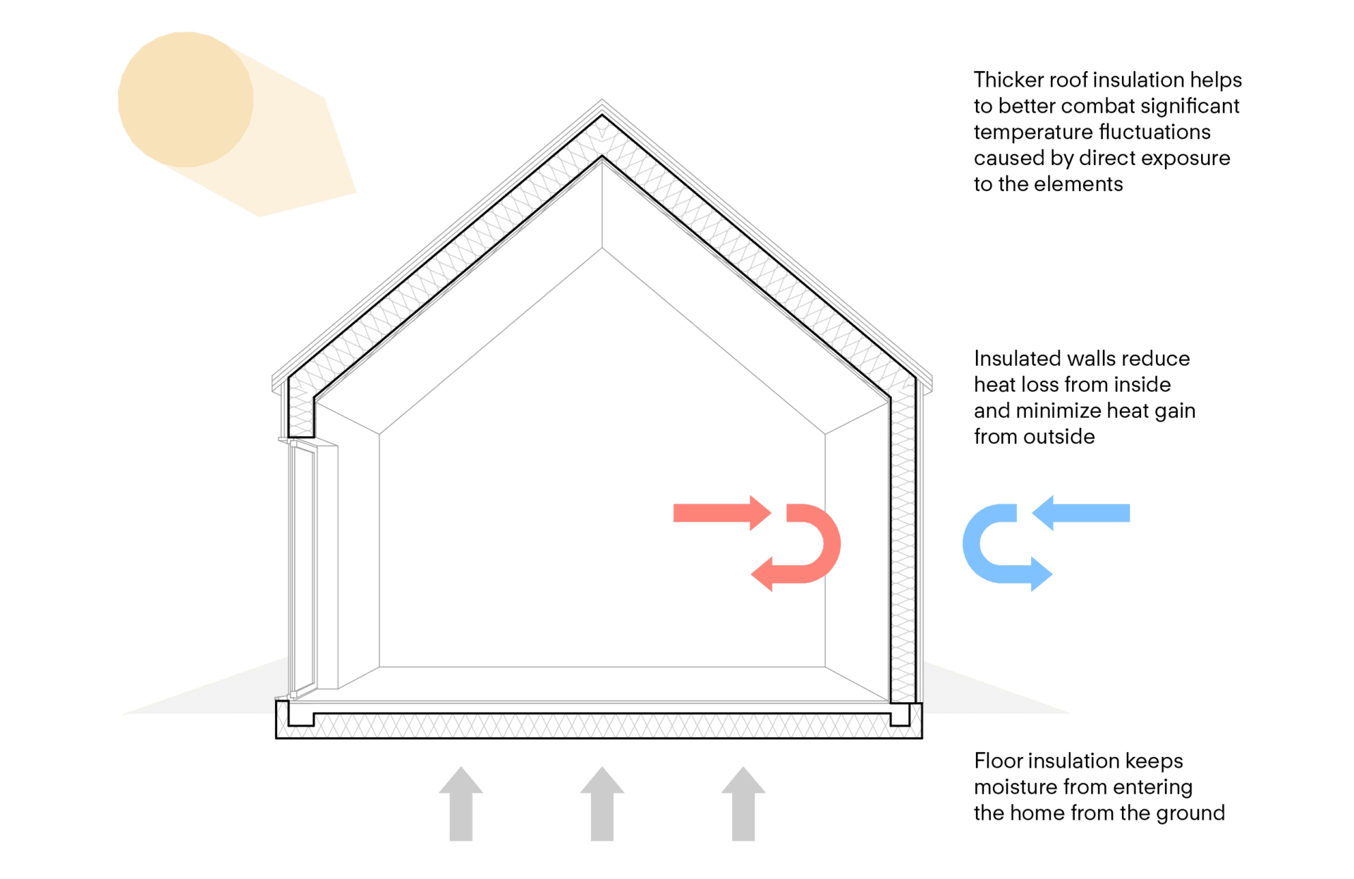 Superior insulation is a building approach that significantly minimizes heat loss or gain by incorporating much higher levels of insulation and achieving exceptional airtightness compared to standard practices. It works behind the scenes to maintain a stable indoor temperature, regardless of the season. During winter, it prevents the warmth from escaping, and in summer, it keeps the heat out. This results in less reliance on heating and cooling systems, translating into significant energy savings.