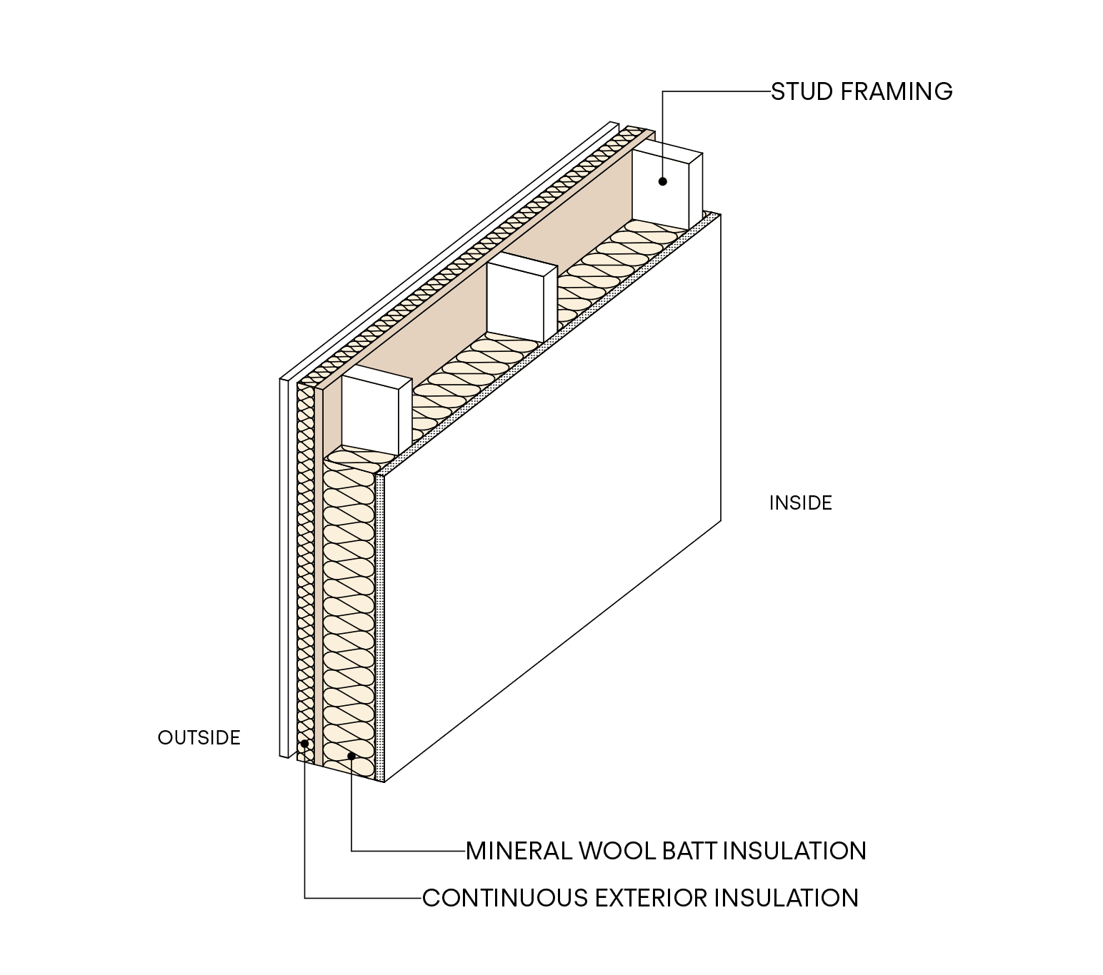 Continuous insulation is applied over the entire building envelope, covering all elements that can create thermal bridging and minimizing heat transfer through them.